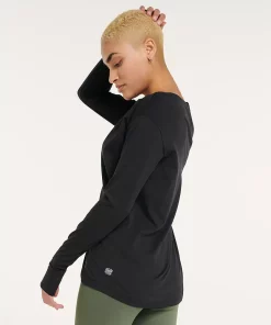 - Drop-shoulder long sleeves with thumbholes